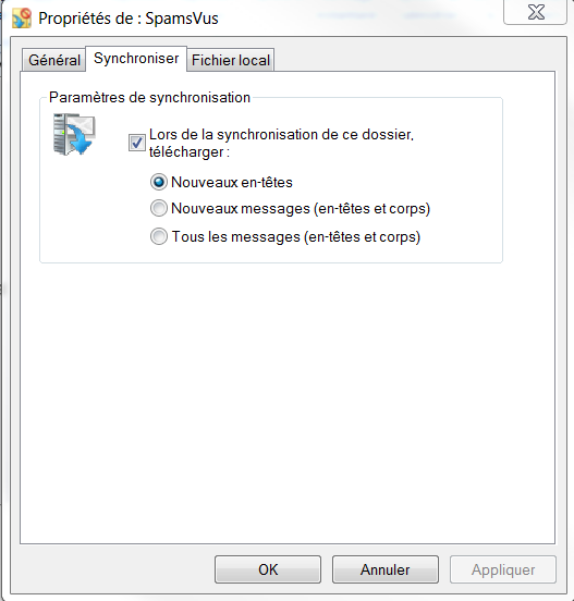 • Autant que possible, ajustez vos paramètres de synchronisation. Préférez l'option "En-têtes uniquement". Il est inutile de charger tous les contenus d'avance alors qu'ils sont accessibles par un simple clic quand vous voulez les lire, le même que celui qui sélectionne quoi lire.